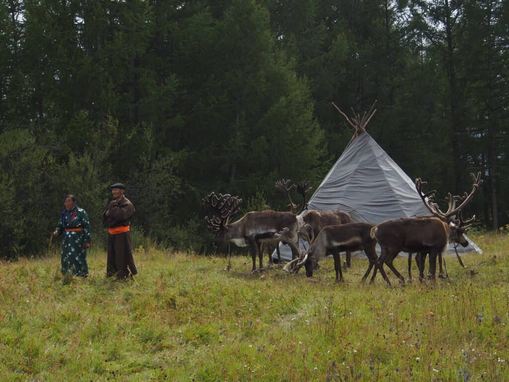In Mongolia’s northern taiga, small clearings open within the forest, where urts stand among larch trees and reindeer move at the edge of camp.